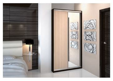 Габаритные размеры: 1400 х 550 х 2200 мм. Цвет ЛДСП венге темный + дуб молочный. Торцы полок облицованы пластиковой кромкой (ПВХ 0,4 мм). Алюминиевая система Версаль (пр-тель Россия) Фасад: зеркало + ДСП, разделенное на три части. ДВП ламинированное. 2 ящика выкатных. Упаковка картон.