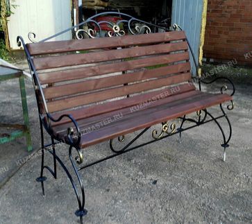 Материал скамейки уличной №18: металлический квадрат 12 мм. покрытие - грунт+эмаль+патина золото, сосновые бруски камерной сушки 80х35мм. пропитанные защитно-декоративным покрытием - Акватекс. Длинна 150 см. Возможно изготовление по размерам заказчиков. None