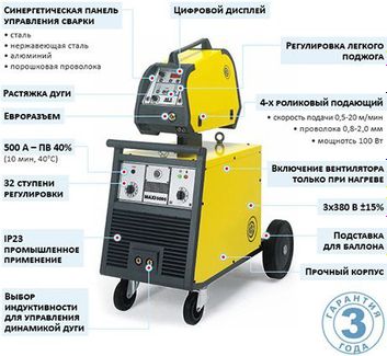 - кабель заземления 4м 50 мм² Простой и надёжный сварочный полуавтомат с отдельным механизмом подачи проволоки. Благодаря минимуму электроники идеально подходит для суровых заводских условий. Превосходный выбор для сварки:Нержавеющей стали, Низкоуглеродистой стали, АлюминияВ комплекте поставляется цифровой механизм подачи проволоки ES 5 с синергетическим управлением, позволяющий на основе материала, газа и диаметра проволоки подобрать оптимальные сварочные параметры. Функции передней панели аппарата MAXI 4005 схожа с таковой у MAXI 405. Особое внимание нужно уделить механизму подачи проволоки ES 5: Внутри достаточно места для размещения катушки с проволокой диаметром до 200мм. Четыре ролика большого диаметра и подающий механизм из литого алюминия обеспечивают непрерывную, безаварийную подачу проволоки. Функции панели управления подающего механизма: • Превосходные сварочные характеристики для любых типов материалов при сварке с любым газом • Идеален для сварки в промышленных условиях • Металлический корпус и лицевая панель с ударопрочным волокном • Подставка для газового баллона в стандартной комплектации • Синергетическая регулировка сварочных параметров • Удобный и простой выбор и вывод параметров и сварочных программ • Точное зажигание дуги благодаря функции цифрового контроля • Превосходные сварочные характеристики для сварки MIG/MAGлюбых типов материалов с любым газомТок, А: 400(230)ПН, %: 40(100)Диам. проволоки, мм: 0,6-1,6Напряжение питания, В: 380Габариты, мм: 1060x600x780Вес, кг: 102 None Страна производства: Италия Есть доставка.