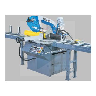 Станок построен по классической схеме полуавтомата. Отличается большой жесткостью, позволяющей пилить заготовки, как из простых конструкционных сталей, так и различных нержавеющих сталей и сплавов. Пильная рама имеет разворот в обе стороны. Тиски раздвигаются на 360 мм., что позволяет пилить прямоугольною заготовку с размерами превышающими рабочий просвет подъема пильной рамы. Модель ARG 300 Plus S.A.F. снабжена частотным регулятором скорости ленты, что позволяет плавно регулировать скорость ленты в диапазоне 15-90 м/мин. Данная опция полезна при пилении цветных материалов и различных сплавов. Основные элементы: Литая чугунная рама гарантирует жесткость конструкции и гасит вибрации В гидростанции предусмотрена функция ограничения давления в тисках (для зажима легко деформированных заготовок) Опускание и подъем рамы осуществляется за счет гидравлики автоматически С помощью вентиля можно задать постоянную скорость опускания рамы Скорость движения ленты регулируется при помощи инвертора от 15 – 90 м/мин Станция охлаждения, обеспечивает подачу СОЖ и расположена внутри тумбы Процесс пиления: Точность движения ленты обеспечивают твердосплавные направляющие и роликовые подшипники Автоматическое выключение ленточного полотна при окончании или обрыве полотна Регулировка угла поворота рамы вдоль шкалы от -45 до +60 градусов Дисплей с отображением скорости движения ленты, простой и удобный для работы оператора Подача СОЖ в зону резания