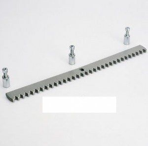В зависимости от ширины воротного проема можно создавать зубчатое полотно любой длины. Одна рейка в длине равна 1 метру. Зубчатая рейка устанавливается вдоль створки, между шестерней и рейкой оставляется зазор примерно в 1-1,5 мм. Необходимо добиться того, чтобы ворота не опирались на шестерню, а, следовательно, и на весь механизм электропривода, тогда автоматика будет исправно работать весь гарантий срок, при любом перепаде температур и любой влажности.