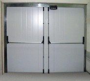 Две створки из стальных сэндвич-панелей толщиной 100 мм Cтандартный цвет серый RAL7004 Поверхность панели гладкая С3 (покрытие полиэстер) Коробка Врезной замок с ручкой Задвижки вертикальные ригельные Терморасширяющаяся лента Предел огнестойкости, не менее 90 мин Усилие закрытия ворот, не оснащенных системой автоматического закрытия, не более 150 H