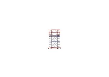 Передвижная сборно-разборная вышка-тура ПСРВ-21, предназначена для производства монтажных, ремонтных и отделочных работ, как снаружи, так и внутри строений, и размещения рабочих и материалов непосредственно в зоне работ.Вышка представляет собой пространственную конструкцию башенного типа из плоских лестниц, имеющих три ступени.Параллельные лестницы устанавливаются в патрубки гантелей и образуют секцию. Для обеспечения жесткости самой конструкции секции соединяются между собой стяжками, которые крепятся на замках лестниц и гантелей. Нижние секции устанавливаются на две базы-гантели, которые соединены между собой объемной диагональю.Базы-гантели имеют четыре колеса. Колеса служат для передвижения вышки.Вышка имеет комплект настилов, который состоит из двух типов – сплошного и с люком. Рабочая площадка оборудована настилами, перекладинами ограждения и боковыми фанерными ограждениями настилов.