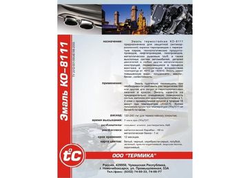 Эмаль КО-8111 чёрная, серебристо-серая, - предназначена для защитной окраски металлических поверхностей, подверженных нагреванию до температуры + 600 С, таких как детали водонагревательного и котельного оборудования, печей для бань, саун, радиаторов отопления и элементов выхлопной системы автомобилей. Может применяться как самостоятельное лакокрасочное покрытие для наружных работ. Термостойкая краска черная матовая КО-8111. Выдерживает температуру до 600C. Позволяет вести точечную окраску. Защищает от коррозии. Для наружных и внутренних работ. Устойчивость к механическим повреждениям и истиранию (полимеризация) после нагрева до 140C в течение 30 минут. ОБЛАСТЬ ПРИМЕНЕНИЯ: Применяется для окраски оборудования, выхлопных и вытяжных систем, частей двигателя, дымовых труб, грилей и т.д. СПОСОБ ПРИМЕНЕНИЯ. Поверхность должна быть сухой и чистой, без ржавчины и жира.