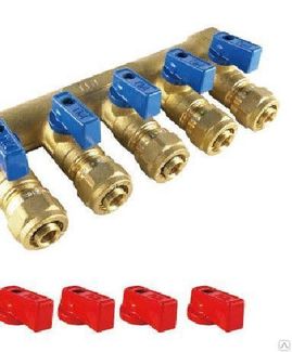 Коллектор с шаровыми кранами 1" х 16 ц- 3 вых. латунный цвет, с цангами под трубу МП Φ16, в комплекте красные и синние ручки None Возможен самовывоз. Есть доставка.