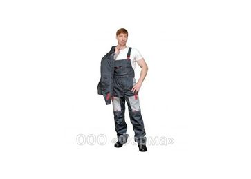 Костюм состоит из куртки и полукомбинезона. Куртка с отложным воротником, с центральной застежкой на молнию, закрытую планкой. По полочкам и спинке - отрезные кокетки. На куртке два прорезных боковых и два грудовых кармана с клапанами. Рукава втачные, с манжетами. Полукомбинезон с отрезыми грудкой и спинкой. На передних половинках - накладные боковые карманы. Боковая застежка и застежка банта на петли и пуговицы. Бретели - с открытой эластичной лентой, их длина регулируется при помощи фаст. Цвет: темно - серый со светлым серым. Ткань: смесовая 65% п/э 35% х/б пл.210 г/м2, ВО.