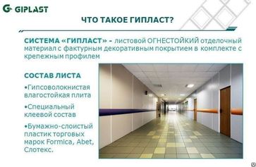 Стеновые панели Гипласт представляют собой гипсоволокнистую влагостойкую панель, облицованную декоративным бумажно-слоистым пластиком. Преимущества панелей Гипласт: огнестойкость (группа горючести - Г1) влагостойкость стойкость к ультрафиолету стойкость к химическим составам и реактивам термостойкость устойчивость к истиранию и другим механическим воздействиям красота и выразительность декоров экологичность и безопасность для здоровья человека Антивандальность Гипласт: пожарный сертификат КМ1 - новые возможности в отделке объектов. Благодаря использованию последних разработок в производстве пластиков HPL огнестойким панелям «Гипласт» присвоен пожарный сертификат КМ1, что значительно расширяет сферу применения продукта и позволяет: использовать панели в помещениях с максимальным числом присутствующих (зальной вместимостью) до 800 чел.; применять панели для внутренней отделки помещений до 17 этажей либо до 50 м высотой. По сумме характеристик (включая такой важный параметр как безопасность для здоровья человека) панели "Гипласт" не имеют себе равных на российском рынке. Эти качества делают огнестойкие панели технологичным и эстетически привлекательным решением при отделке объектов с повышенными требованиями к пожарной безопасности, таких как: школы и детские сады, больницы и поликлиники, магазины, кафе, рестораны , аэропорты, торговые и спортивные комплексы, кинотеатры, дома культуры, и т.п. Пожарный сертификат на соответствие техническому регламенту о требованиях пожарной безопасности. Урал-Плита - представитель стеновых панелей Гипласт по выгодной цене за м2, которые прекрасно подходят для внутренней отделки жилых и общественных зданий, а также для придания дополнительной прочности внутренней отделке. Новая система, усиленная полипропиленовой пленкой, успешно применяется на объектах коммерческой и социальной инфраструктуры, а также административных помещениях: больницы и поликлиники;