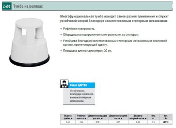 Высота тумбы 0,43 м. Диаметр поверхности 29 см. Оборудована подпружиненными роликами. Устойчива благодаря стопорным механизмам и резиновой кромке, защищающей от сдвига. Запатентованное быстрое крепление элементов обеспечивает лёгкость сборки.