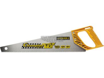 Ножовка по дереву STAYER CHAMPION, арт. 15133-45_z01, серия PROFI, – профессиональная ножовка со сверхбыстрым резом для поперечной распиловки древесины твердых и мягких пород. Ножовки по дереву STAYER CHAMPION изготовлены из высококачественной стали, специальная технология заточки гарантирует максимальную скорость и точность распила. Полотно из высококачественной углеродистой стали SK5. Импульсная закалка каждого зуба по отдельности обеспечивает максимальную твердость, длительное сохранение заточки и увеличивает срок службы ножовки. Закалка наполовину высоты зуба предотвращает их выламывание в процессе работы. Специальная технология заточки гарантирует максимальную скорость и точность распила. Эргономичная рукоятка из ударопрочного пластика обеспечивает надежный и комфортный хват. Материал полотна: сталь SK5. Материал рукоятки: ударопрочный пластик. Упаковка: пластиковый чехол, бумажная этикетка. Общие характеристикиТипПлотницкаяДлина полотна450 ммКол-во зубьев на дюйм7РукояткаПластиковая None Есть доставка.
