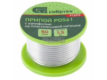 - Припой с канифолью Сибртех 913375 (D 1,5 мм, 50 г, POS61, пласт. катушка) в каталоге Флюсы, припой в Екатеринбурге;