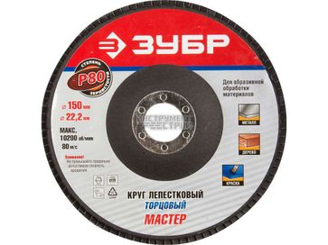 - Круг шлифовальный лепестковый торцевой Зубр 36592-150-80 (P80, 150мм) по выгодной цене 182 р. руб.;