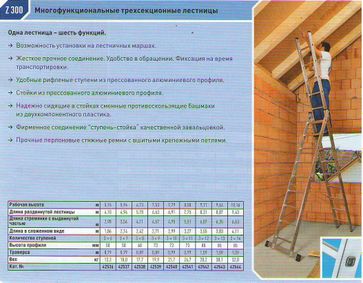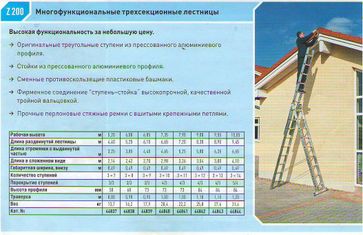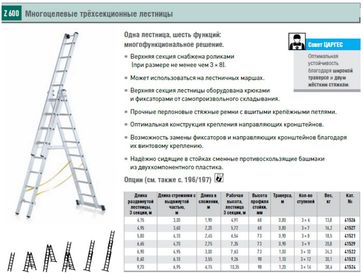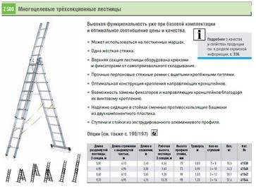 Многофункциональные универсальные трехсекционные лестницы соответствуют стандартам EN 131 и BGV D 36. Многофунциональность моделей программ Z200, Z300, Z500, Z600 достигается за счет шести конструктивных вариантов использования техсекционных лестниц. Многофункциональные лестницы программ Z300, Z500 и Z600 могут работать на разноуровневых поверхностях (например, лестничный марш), путем использования съемной третьей секции входящей в стандартную комплектацию. Пластиковые бикомпонентные башмаки лестниц производства Zarges в нижней части стоек предотвращают от скольжения. Высокий уровень безопасности при спуске и подъеме обеспечивают узкие рифленые ступени, изготовленные из прессованных алюминиевых профилей. Важное преимущество: Лестницы стремянки 3 х секционные легко и компактно складываются, что очень удобно для транспортировки и хранения. Это выгодное преимущество экономит пространство и повышает рентабельность. Лестница 3 х секционная - одна из наиболее популярных моделей лестниц. Мы предлагаем Вам ознакомиться с ассортиментом трехсекционных универсальных лестниц Zarges. Многофункциональная лестница 3 х секционная: основные преимущества