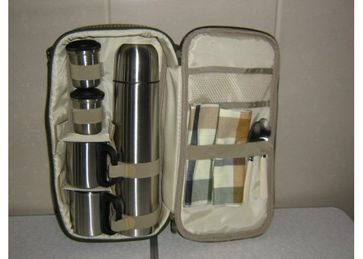 Материал: полиестр 600D. Набор включает в себя: Термос из нержавеющей стали, 2 кружки, 2 емкости под сахар и кофе, 2 салфетки и 2 ложки. Впереди имеется карман. Размеры: 37х18х8см. Все компоненты набора видны на рисунке. None
