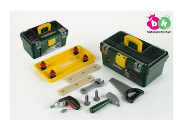 Все как у папы! В большом фирменном ящике BOSCH - набор инструментов из пластмассы. В наборе: молоток, ручная пила, гаечный ключ, шуруповерт со звуковым и световым эффектами и механизмом вращения (для работы необходимы батарейки), детали, кот. можно свинтить с помощью винтов и гаек, так же входящих в набор. None