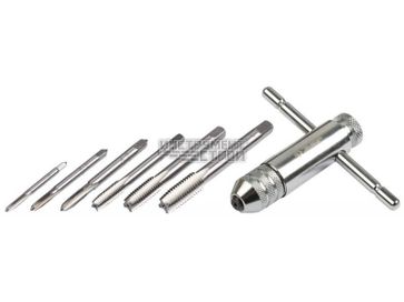 Метчики и плашки изготовлены из инструментальной легированной стали 9ХС. Метчики однопроходные и комплектные №1 и №2 (черновой и чистовой). Метчикодержатели с регулируемым винтовым механизмом для фиксации хвостовиков метчиков и насечками на ручках. Плашкодержатели со стопорным винтом для фиксации плашки и насечками на ручках. Торцевой метчикодержатель с зажимным патроном для фиксации хвостовиков метчиков при нарезании резьбы в труднодоступных местах. Наборы предназначены для нарезания внутренней метрической резьбы с нормальным и мелким шагом и трубной резьбы в сквозных и глухих отверстиях и внешней резьбы на изделиях из стали и цветных металлов. Поставляются в пластмассовом боксе и на карточке. Общие характеристикиТипНаборКомплектацияМетчикодержатель - 1 шт Метчики однопроходные (3х0.5, 4х0.75, 5х0.8, 6х1.0, 8х1.25, 10х1.5) - 6 шт None Есть доставка.