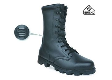 Верх: гидрофобная кожа (толщина 2.0 – 2.2 мм)Подкладка: безподкладочныйПодошва: каучук повышенной износостойкости (Италия)Метод крепления подошвы: клеевойСупинатор: металлическийПодносок и задник: усиленный из термопластического материала TECNO GI (Италия)Высота берца: 25 смРазмеры: 40-46Глухой клапан предохраняет ногу от воздействияокружающей среды (пыль, вода, грязь) скоростная шнуровкаЦвет: черныйСтелька: 2-х слойнаяВ пяточной части амортизирующая вставкаВес: 720 гр None