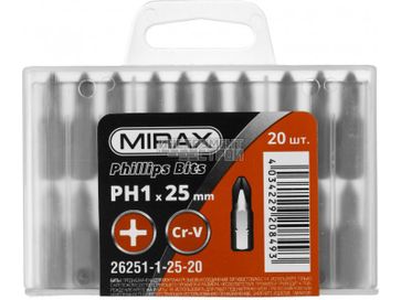 - Биты Mirax 26251-1-25-20 (PH№1, хвостовик C 1 4", длина 25мм, 20шт) по выгодной цене 113 р. руб.;