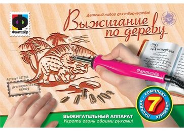 Выжигательный аппарат Доисторический период является качественным прибором для выжигания по дереву. В набор для детского творчества входит: шесть сменных насадок, а именно насадка для мелких деталей, универсальная насадка, которой можно работать как пером, коническая насадка, которой можно выжигать тонкие линии, доска для выжигания (фанера).Выжигательный прибор является электрическим прибором, требующим соблюдением мер безопасностиДанный детский набор для творчества будет хорошим подарком для детей и для взрослых. None