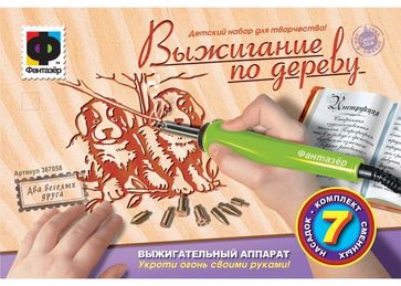 Выжигательный аппарат Два веселых друга является качественным прибором для выжигания по дереву. В набор для детского творчества входит: шесть сменных насадок, а именно насадка для мелких деталей, универсальная насадка, которой можно работать как пером, коническая насадка, которой можно выжигать тонкие линии, доска для выжигания (фанера).Выжигательный прибор является электрическим прибором, требующим соблюдением мер безопасностиДанный детский набор для творчества будет хорошим подарком для детей и для взрослых. None