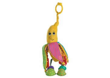 Подвесная игрушка бананчик Анна. Пластмассовое кольцо погремушки позволяет легко и быстро прикрепить ее к дугам развивающего коврика или к дуге, установленной на кроватке малыша, на автокресло или прогулочную коляску. Ребенок рассматривает яркий банан, висящий над ним, трогает его, и получает первое представление о цвете, форме, материале. Ножки банана гремят, на каждой по два колечка, разные на ощупь. В стопах банана - два зеркальца. Ладошки сделаны в виде прорезывателей для зубов из мягкого безопасного пластика, а ручки растягиваются, если их потянуть. Игрушка развивает тактильные ощущения у малышей. Размер погремушки: 12х12х38 см. None