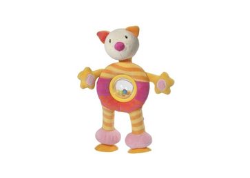 Развивающая погремушка с котиком. Погремушка состоит из мягкого материала и пластика (основа игрушки). Разнообразные материалы игрушки способствуют развитию тактильных ощущений у малышей. Ребенок держит погремушку за удобную ручку со множеством разноцветных шариков внутри. Он рассматривает погремушку, стучит ею, наблюдает за бегающими разноцветными шариками внутри прозрачной основы погремушки и прислушивается к гремящим звукам игрушки. Погремушка может подвешиваться к кроватке, манежу или дугам развивающего центра. Игрушка развивает мелкую моторику пальцев рук, ловкость движений. Мягкая погремушка «Забавный Кот» крепится к любой ровной поверхности при помощи двух присосок, расположенных у котика на лапках. В животике у него — прозрачный шарик, который можно всего лишь одним легким движением пальца заставить крутиться, при этом разноцветные бусины и пластмассовая бабочка, расположенные в шаре, начнут подпрыгивать и шуметь None