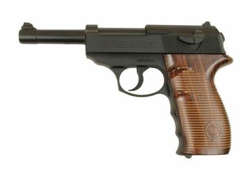Технические характеристики:Калибр, мм: 4,5Источник энергии: баллончик СО2, 12 гр.Скорость пули, м/с: 150Емкость магазина: 18 шариков BBВес, г: 900Материал корпуса: металлМатериал рукоятки: пластикПневматический полуавтоматический пистолет калибра 4,5 мм. Имеет стальной ствол. Пистолет изготовлен из сплава металлов, что придает ему вид и массивность боевого прототипа. Рельефная рукоятка удобна для лево- и праворуких стрелков. Оружие смоделировано по образу легендарного немецкого пистолета времен Второй Мировой войны Walther P-38. В качестве источника энергии используются 12-граммовые баллончики СО2. Легко сдвигающаяся рукоятка позволяет быстро заменять баллон и проводить больше времени за активной стрельбой. Прицельная планка и мушка обеспечивают точную стрельбу. None