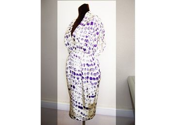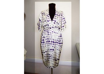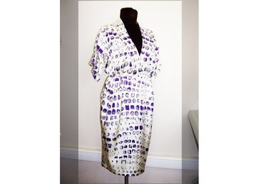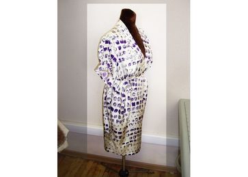 ПЛАТЬЕ с V-образным вырезом,с рукавами а-ля кимоно, с удобной резинкой по линии талии,что создает комфорт при движении,и придает легкость в жаркую погоду.Платье из натуральной ткани светло-кремового тона с интересной печатью фиолетового цвета. Рукава свободного кроя, низ рукавов соединен с линией предплечья при помощи специальной детали, выполненной из ткани в тон платью. Указанная деталь делает рукав легким,удобным и оригинальным,напоминая верхнюю часть кимоно!Благодаря удобной резинке по линии талии, Платье всегда будет в Вашем гардеробе, несмотря на возможные изменения фигуры. Для клиентов,проживающих за пределами города Екатеринбурга, возможна доставка Почтой России, или любой другой Службой доставки.