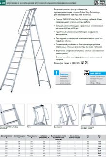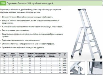 Высота площадки до 3,11 м. Если Вы решили купить алюминиевую стремянку, то Вы сделали правильный выбор, остановившись на продукции Zarges. Алюминиевые стремянки Zarges изготавливаются на заводе в Германии из уникального алюминиевого сплава с высоким содержанием магния, марганца и кремния. Обладая уникальными характеристиками, наша продукция может использоваться и как профессиональная стремянка алюминиевая, и как бытовая. Применяемая группа сплавов дает оптимальную возможность производить легкую и в тоже время жесткую конструкцию стремянки алюминиевой. Для производства алюминиевых стремянок Zarges используется прессованный профиль. Методом холодной тройной вальцовки двух полых коробов мы получаем неподвижное соединение "ступень-стойка". Широкий выбор такой продукции, как стремянка алюминиевая, купить которую Вы можете в нашем магазине, позволяет подобрать необходимую модель в зависимости от нагрузок, области применения и вашего желания! У нас вы можете купить следующие виды продукции: