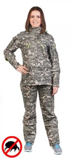 Особенности:- состоит из куртки с капюшоном и брюк;- куртка с застежкой на молнию, надевается через голову;- капюшон с козырьком, регулируется по объему эластичным шнуром и хлястиком, при желании складывается и убирается в воротник-стойку;- 4 кармана на куртке: два нагрудных скошенных на молнии, один прорезной на молнии на левом рукаве и ещё один объемный с клапаном на правом рукаве для телефона / рации;- 2 многофункциональных накладных кармана на брюках;- объемный крой локтевой и коленной зоны для полной свободы движений;- 4 молнии на куртке облегчают надевание и снятие, а также могут быть использованы для регулировки костюма по размеру;- механические ловушки выделены контрастными элементами;- нижняя часть куртки с тонкой хлопчатобумажной подкладкой, заправляющейся в брюки;- брюки с застежкой на пуговицу и молнию, пояс с резинкой по бокам и 5 шлевками для ремня;- рукава и брюки снизу с внутренними манжетами, манжеты брюк заправляются в обувь;- штрипки по нижнему краю брючин, не позволяющие штанине задираться;- накладные карманы, капюшон, все планки, закрывающие молнии обработаны убивающим клещей средством;- обработанные противоклещевым средством участки костюма не контактируют с кожей ; None