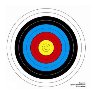 Мишень FITA 40см является стандартной оффициальной мишенью для лука и арбалета. Используется на всех соревнованиях по стрельбе из лука. Дистанция стрельбы по этой мишени 18 метров. Диаметр круга 40 сантиметров. None