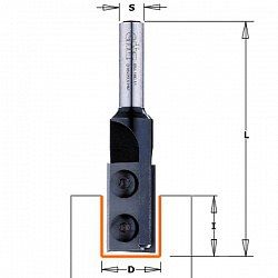 Прямые фрезы с двумя сменными ножами, фиксируемыми винтами. Форма твёрдосплавных ножей не прямоугольна - угол заточки 3° для лучшего зарезания в материал. При затуплении первых режущих граней, ножи легко переворачиваются для работы вторыми острыми гранями. Работы: создание пазов, фрезерование с боковым или торцевым заходом. Материалы: мягкая или твёрдая древесина. Техника: ручной фрезер, станок с программным управлением. Ножи сменные, поворотные из микрозернистого твёрдого сплава.D... None