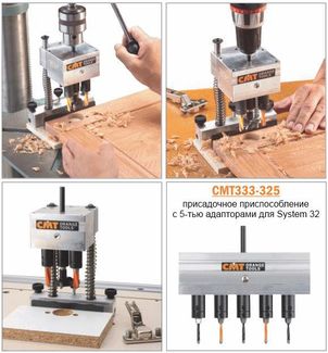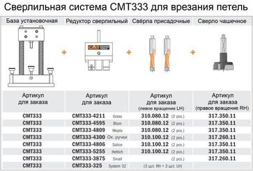 Сверлильная система CMT333 с возможностью выбора редуктора для различных популярных отверстий под мебельные петли, например, «лягушки», с чашкой 35 мм – Блюм (Blum), Хеттих (Hettich), Грасс (Grass), Саличе (Salice), Мепла (Mepla), Вюрт (Würth) и чашкой 26 мм - оконные петли (window handles), малые петли (small hinges - , например, петли Ikea) Для сверла чашечного 35 мм: CMT333-4595 Блюм (Blum) - сверла 308.080.12 (или 310.080.12) – 2... None