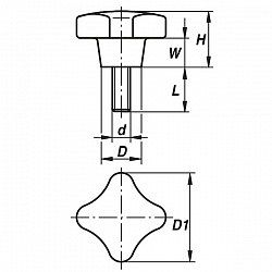 Рукоятки крестообразные DIN 6335 форма L с наружной резьбой (с винтом). Материал ручек: дуропласт PF 31, черный; с резьбовым винтом из оцинкованной стали; исполнение ручки: материал отполирован до блеска. D d L W H D1 Артикул 12 М5 30 8 16 25 K0148.505X30 14 М6 30 10 20 32 K0148.506X30 14 М6 40 10 20 32 K0148.506X40 18 М6 50 10 20 32 K0148.506X50 18 М8 30 13 25 40 K0148.508X30 18 М8 40 13 25 40 K0148.508X40 18 М8 50 13 25 40 K0148.508X50 None