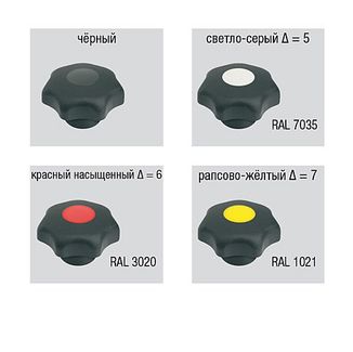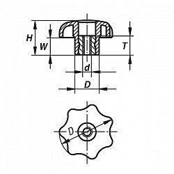 Рукоятки звездообразные DIN 6336 форма D с внутренней резьбой (с гайкой). Материал ручек: термопласт черный; резьбовая втулка из оцинкованной стали с синим хроматированием. Под заказ по запросу возможны различные цвета крышек (укажите цветовой код крышки (см. Фото); для крышки черного цвета цветовой код не требуется). D d W T H D1 Артикул 14 М5 10 10 20 32 K0155.5051 14 М6 10 10 20 32 K0155.506 18 М8 13 14 25 40 K0155.508 18 М10 13 14 25 40 K0155.5101 22 М12 17 18 32 50 K0155.5121 None
