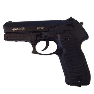 Пистолет пневматический GAMO PT-80Калибр,мм: 4.5 Емкость магазина (кол-во пуль): 8Тип: газобаллонный Тип пуль: свинцовые пули тип "Diabolo"Вес (гр): 500Мощность: < 3.0 ДжСкорость выстрела (м/с): 120Длина (в мм): 180Источник энергии: CO2 12 гр. Материал:сталь оружейная, пластик None