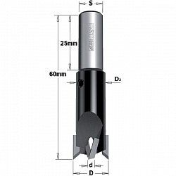 Зенкеры с цилиндрическими хвостовиками для сверления глухих отверстий Технические особенности: • корпус из высокопрочной стали • правое вращение; • 2 прецизионные режущие грани HW Z2; • 2 подрезные грани с отрицательным углом заточки HW V2; • цилиндрический хвостовик подходит для большинства сверлильных патронов. Применяется для сверления и зенкерования отверстий в цельной древесине и её производных (ДСП, OSB, МДФ).D d S вр. D2 Угол Артикул 12 4 10x25 RH 10 90° 515.412.11 14 4... None