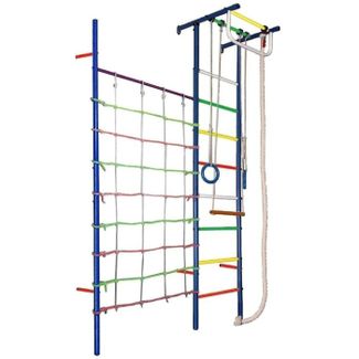 Детский спортивный комплекс Вертикаль Юнга № 4м.с ДСК с ПВХ-покрытием перекладин.Комплектация: цветные перекладины, турник с узким хватом, металлическая шведская стенка, канат, кольца гимнастические, трапеция, турник с сеткой 1х2 метра.Ширина перекладин шведской стенки: 450 мм.Устанавливается креплением к стене. Высота: 2.35 м.Нагрузка на один элемент конструкции: 90 кг. None