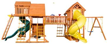 Игровая площадка PlayGarden Mega SkyFort с двумя игровыми домиками и переходом Игровой домик Castle с деревянной крышей и элементом “солнышко”. Качельная балка с «А» опорой 3-х позиционная: с двумя мягкими качелями на металлических цепях, покрытых пластиком, и качелями-диск пластиковый на канате Горка-труба пластиковая с поворотом на 270 градусов Горка с двойной волной, длиной 2,75 метра (возможна комплектация горкой желтого или зеленого цвета) None