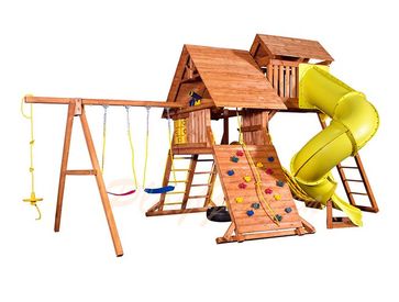 Игровая площадка PlayGarden Original Castle Turbo с двумя горками и пентхаусом Игровой домик Castle с деревянной крышей и элементом “солнышко”. Качельная балка с «А» опорой 3-х позиционная: с двумя мягкими качелями на металлических цепях, покрытых пластиком, и качелями-диск пластиковый на канате Горка-труба пластиковая с поворотом на 270 градусов Горка с двойной волной, длиной 2,75 метра (возможна комплектация горкой желтого или зеленого цвета) None