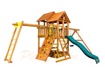 Игровая площадка PlayGarden SkyFort II стандарт с рукоходом Двухуровневый игровой домик с деревянной крышей и элементом “солнышко”, высота игровой платформы 1,42/1,52 метра, размеры игровой платформы 1,32*2,11 метра Качельная балка с «А» опорой 3-х позиционная: с мягкими качелями и качелями/трапецией с ручками на металлических цепях, покрытых пластиком, с качелями-диск пластиковый на канате Горка с двойной волной, длиной 2,75 метра Лестница-рукоход «Манки-бар» None