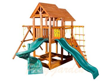 Игровая площадка PlayGarden SkyFort Spiral со спиральной горкой Двухуровневый игровой домик с деревянной крышей и элементом “солнышко”, высота игровой платформы 1,42/1,52 метра, размеры игровой платформы 1,32*2,11 метра Качельная балка с «А» опорой 3-х позиционная: с мягкими качелями и качелями/трапецией с ручками на металлических цепях, покрытых пластиком, с качелями-диск пластиковый на канате Горка с двойной волной, длиной 2,75 метра Горка спиральная пластиковая None