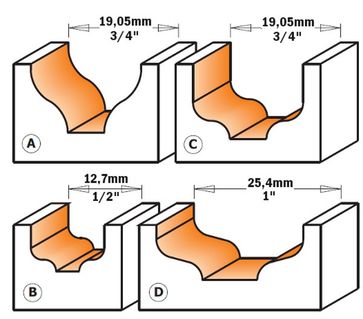 Фрезы с напайками из твёрдого сплава для декорирования, создающие утонченные края, идеальные для украшения мебельных фасадов. Гравируйте и создавайте этими фрезами тонкие аккуратные декоративные радиусные элементы, украшающие двери или мебельные фасады. Данными фигурными фрезами можно врезаться в материал и делать гравировку. D l d L Z R S размер профиль Артикул 12,7 8 4 51 2 2 6,35 d=4 мм B 865.002.11 12,7 8 4 51 2 2 8 d=4 мм B 965.002.11 19 13 6,35 68 2 3,2 12 d=6,35 мм C... None