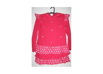 Размеры: 28(рост 110), 30 (рост 116), 32(рост 116-122), 34(рост 122-128) Замечательное платье с длинными рукавами, украшенными декоративными крылышками, и округлым вырезом горловины. Модель оформлена кокетливыми оборками и стразами. Цена указана оптовая.