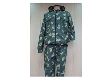 Куртка+брюки. Куртка с капюшоном, на молнии, внизу на резинке. Рукава втачные на манжете. Карманы на груди накладные с клапаном на липучке, листочки внизу. Брюки с резинкой на поясе и внизу. Карманы с косым входом по бокам.