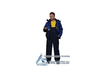 Костюм состоит из куртки и полукомбинезона. Куртка укороченная на поясе, СОП 50 мм. Полукомбинезон. Утеплитель ситтепон, подкладка тафета. Цвет: т.синий + василек. Ткань: смесовая пл. 210 г/кв.м. состав 65% п/э. 35% х/б.