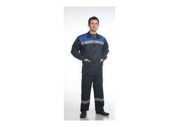Куртка и брюки. На куртке на нижних боковых кармана и один нагрудный. Кокетка василек. На груди и по низу брюк настрочена светоотражающая полоса шириной 50мм.
