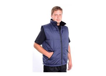 Жилет синий утепленный с воротником-стойкой, с внутренней стороны отделка флисом. Застегивается на тракторную молнию. Имеются два наружных боковых кармана на молнии и один внутренний. По низу имеется утягивающая резинка с фиксаторами по бокам. Производится из ткани Дюспа. Размеры: с 44-46 по 56-58. Цена круп.опт: 480 руб. Цена мелк.опт: 528 руб.