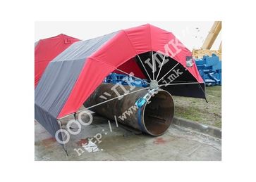 Палатка сварщика «Сфера-1420». Укрытие для ведения работ на трубопроводах диаметром 326-1420 мм (сборно-разборный каркас из конструкционной стали со съемными регулируемыми по высоте выдвижными опорами), габ.разм. ширина/высота над трубой/длина вдоль трубы, мм: 4050/1410/2500 Возможно исполнение каркаса укрытия в варианте: 1) "Эконом" - конструкционная сталь; 2) "Профи" - нерж. сталь. Тент укрытия выполнен из ткани плотностью с масловодоотталкивающей (МВО) и огнеупорной (ОП) пропиткой.