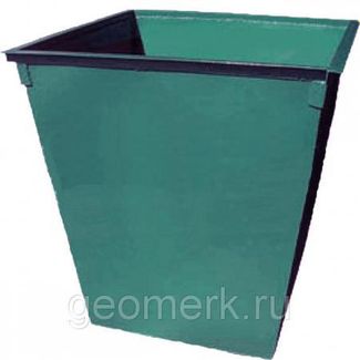 Контейнер обварен сплошным швом. Ширина по верху: 980мм Ширина по низу: 700мм Высота: 1100мм Обрамление по верху: уголок 40404мм. Усиление по углам: уголок 40404мм L–100мм. Ножки: уголок 40404мм L- 50мм. Покрытие: эмаль ПФ 115. Цвет: зеленый, синий или любой другой по желанию заказчика. Возможно нанесение надписей и логотипов. None