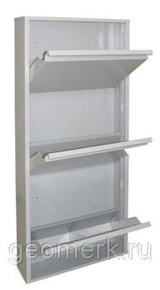 Шкаф изготовлен из стального листа толщиной 1мм. Представляет собой сварную конструкцию повышенной прочности. Оборудован тремя откидными полками. Полки сконструированы так, что позволяют хранить различную обувь, в том числе и обувь с высоким голенищем.